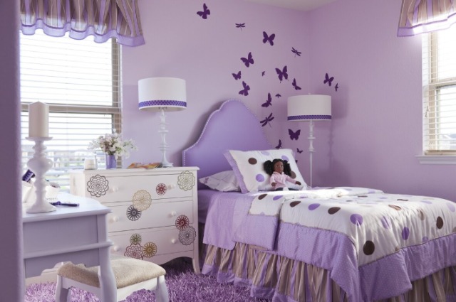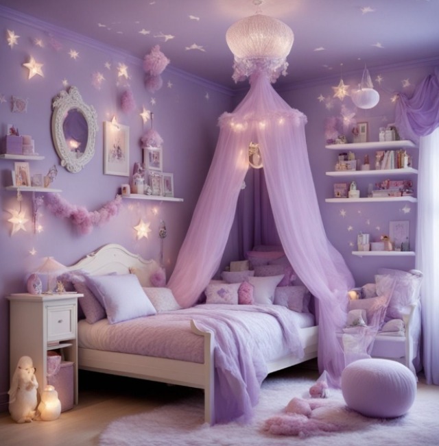 Phòng ngủ màu tím cho bé gái thường được trang trí với các họa tiết vui tươi để kích thích trí tưởng tượng của trẻ. Việc sử dụng đồ nội thất màu trắng kết hợp với sắc tím nhẹ nhàng sẽ tạo ra không gian dễ thương và thoải mái.