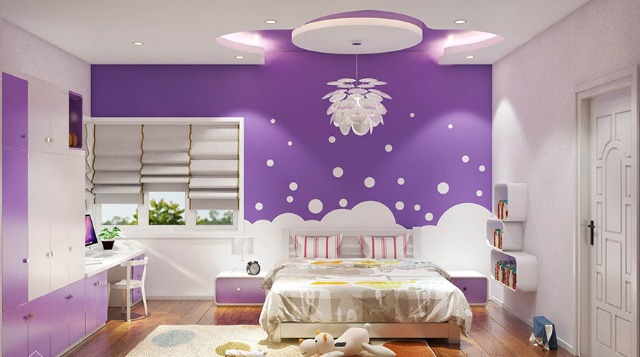 Màu sơn tường là yếu tố quan trọng quyết định sự thành công của thiết kế phòng ngủ màu tím. Bạn có thể chọn sơn phòng ngủ màu tím chỉ với một bức tường làm điểm nhấn hoặc dùng giấy dán tường họa tiết để tăng thêm phần thú vị cho căn phòng.